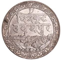 INDIA, Princely State, Mewar, Chitor mint, (KM.26), Udaipur mint (KM.32), another machine made (KM.Y.11) (illustrated); another machine made issues, Fatteh Singh (VS 1941-1986, AD 1884-1929), (KM.Y.25.1) (illustrated). First coin fine, others extremely fine - uncirculated. (3)