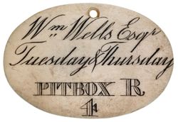 HER MAJESTY'S THEATRE AND OPERA HOUSE, ivory tickets, all oval (50x35mm), 1851 rev. 'J.L. Zulwela Esq./Thursday/Stall 136'; another rev. 'Wm Wells Esq./Tuesday and Thursday/Pitbox R/4'; 1856 rev. 'Mrs. Phillips/Box 69 1/2 /5' (cf Withers 340, 1, 3). Good very fine. (3)