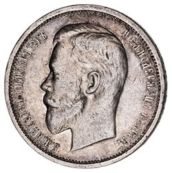 RUSSIA, Empire, Nicholas II, silver rouble, 1899 (KM.Y.59.3); silver 50 kopeks, 1899, 1913 (KM.Y.58.2). Nearly very fine; good; very fine. (2)