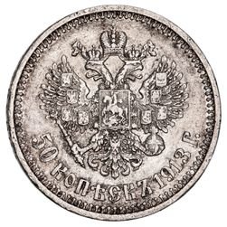 RUSSIA, Empire, Nicholas II, silver rouble, 1899 (KM.Y.59.3); silver 50 kopeks, 1899, 1913 (KM.Y.58.2). Nearly ...