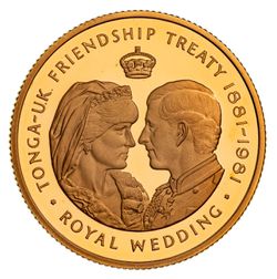 TONGA, Tupou IV, proof two coin set, 1981, one of five Rau, Tonga - UK Friendship Treaty 1881-1981 and Royal Wedding of Charles and Diana (KM 75, 76). In Royal Mint case of issue, FDC.