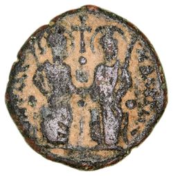 HERACLIUS, (610-41), 40 nummi countermark on a copper follis of Justinian I (527-65), obv. countermark ...