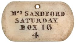 HER MAJESTY'S THEATRE AND OPERA HOUSE, ivory tickets in oval shape (50x38mm), 1840 rev. 'H. Grosett Esq./Tuesday/Stall 208'; 1842 T.G. Pole oblong with rounded ends rev. 'Mifs E. Bryan/Pitbox 16/1' (cf Withers 333 and 332), another similar oblong (50x29mm) 1847 rev. 'Mrs. Sandford/Saturday/Box 16/4'. Pierced as usual, very fine or better and rare. (3)