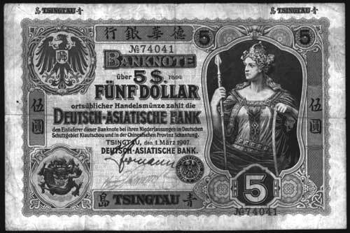 (CHINA), Kiau Chau, Deutsch-Asiatische Bank, five dollars issued note, Tsingtau, dated 1 March 1907, No. 74041, no imprint, signed, green and brown on white, back green and brown on white, (P. 2a). Various creases, otherwise fine and very rare.