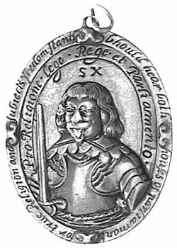 EARL OF ESSEX, Military Reward, 1642, silver, unsigned, probably by Thomas Rawlins, half-length cuirassed bust almost facing, holding sword vertically and wearing falling lace collar and sash around waist, reverse two houses of Parliament in session with King and Speaker, 27x35mm. (MI.i.295/113), cast and chased oval badge with leep for suspension. Extremely fine. $ Ex Spink Sale 120, lot 325