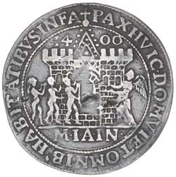 NETHERLANDS, Southern area, silver token 31mm, dated 1400 but issued later, Mechelen, (6.12 g), obv. M‚reau Hospice of the Holy Spirit (Geest-Armhuis), around PAX HVIC DOMV I ET OMNIB HABITATIBVS, in centre the fortified hospice, with an angel welcoming two men and a woman naked, in exergue, ú M ú IA ú IN ú. rev. around SCF SPTIRT ASSIT NOBIS GRATIA VT VI, the dove of the Holy Spirit wings displayed, surrounded by rays, (Min., 411; Van den Bergh -; Dugn., 420 var [Our Lady of Hanswyck]). Toned, good fine, several field knocks, rare and a very interesting example of medieval medical art.