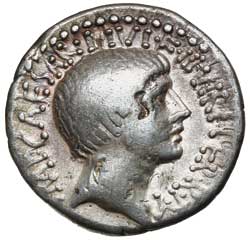 OCTAVIAN, (37 B.C.), silver denarius, mint moving with Octavian, (3.81 g), obv. Octavian head to ...