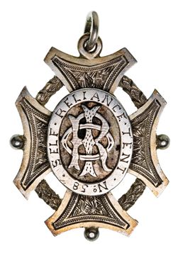 SELF RELIANCE TENT NO 58 MEDAL, in silver (25.97g; 39.5x51mm), by H.Page, features a cross shaped medal with engraved decoration on both sides and with a wreath between the cross arms, in the centre of the obverse are the monogrammed initials ROI, with ring top suspension. Toned very fine.