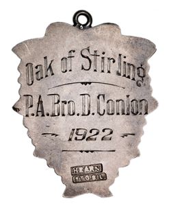 UAOD, (United Ancient Order of Druids), fob medal award in silver (28x33mm), by (J.T.) Hearn, with an acorn on the obverse, reverse inscribed, "Oak of Stirling/P.A.Bro.D.Conlon/1922", with ring top suspension; Victory Lodge No 37, fob award in silver (17x29mm), by (I.E.) Hall, the fob in the shape of an acorn, reverse inscribed, "Won by/Bro T.Dunk/for proposing/members/1926", with ring top suspension, with unofficial box. Very fine; very good. (2)