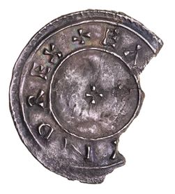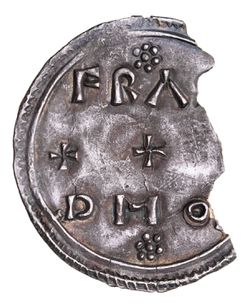 EADMUND, (939-946 AD), silver penny (1.19g), two line type, moneyer Frard, Chester (?) mint, obv. small cross, +EADMUND REX, rev. FR[A]RD MON, three cross patees between, seven pellets above and below. Missing 1/3 of the coin, dark toned, very fine and scarce.