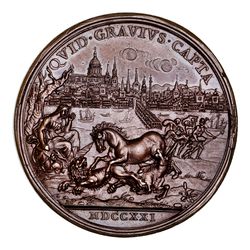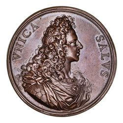 GEORGE I, Prince James(III); 1721 in bronze(950mm) by O. Hamerani for the only safeguard the Old Pretender after the Hannoverian Accession of 1714 and the South Sea Buble debacle in 1720(Eimer 493; M1 ii 454/63). Good extremely fine.