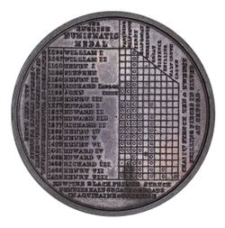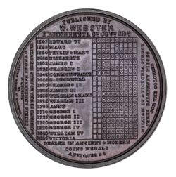 NUMISMATIC MEDAL, circa 1840, bronze 45mm, by W. Taylor, published by W. Webster, Dealer in Ancient and Modern Coins, listing all the Rulers from William I to Victoria, showing what denominations of coinage (from Farthing to Crown) were issued in each reign. Good extremely fine and very rare.