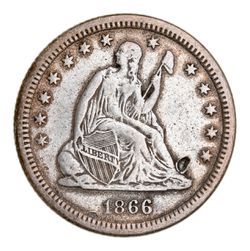 USA, LIBERTY SEATED SILVER QUARTER 1866S. Gouge mark at feet otherwise nearly very fine and scarce.