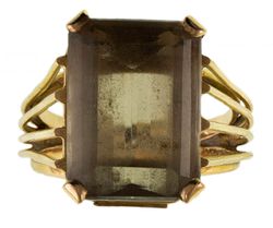 LADY'S DRESS RINGS, smokey quartz trap cut gem (approx 3g), four claw bezel set, wire ...