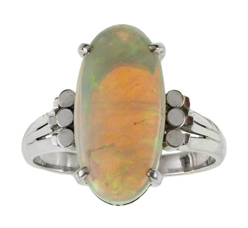 LADY'S OPAL RING, oval cabochon opal bezel set with 4 arms in a filigree basket, fancy shoulders, hallmarked 900PT (7.47g total weight). Good very fine.