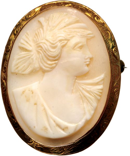 CAMEO BROOCH, vintage carved shell design in a decorated oval gold frame (9ct; tot wt 7.67g; 31x40mm), pin-back with safety chain. Good very fine.