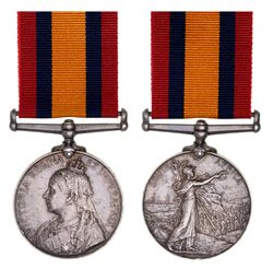 QUEEN'S SOUTH AFRICA MEDAL 1899, (type 2 reverse), no clasps. 129 Pte E.H.Farmer, Qnslnd: M.R. Impressed. Edge nicks and toned, otherwise very fine.