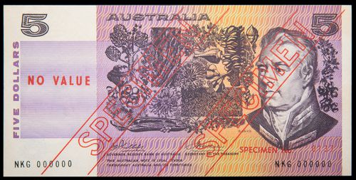 FIVE DOLLARS, Phillip/Wheeler, (1974), type three specimen NKG 000000, specimen no 0169 (R SP13). Uncirculated. ...