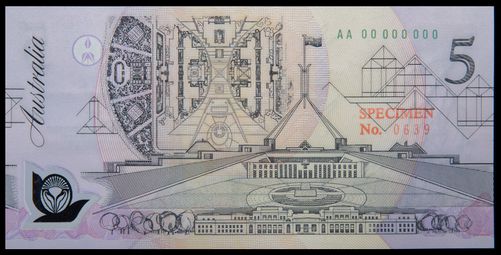 FIVE DOLLARS, Fraser/Cole, (1992), specimen note, AA 00 000000 specimen No.0639. Nearly uncirculated.
