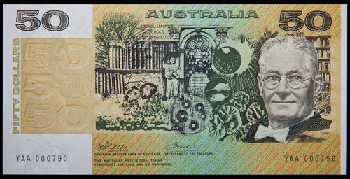 FIFTY DOLLARS, Phillips/Wheeler (1973) YAA 341058 and YAA 805925 (R.505F) first serial prefixes. Very fine; ...