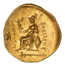 THRACE, Kingdom of, Lysimachos, (305-281 B.C.), gold stater, (8.52 g), uncertain mint but probably Byzantium, issued after 281 B.C., probably about 200 B.C., obv. head of Alexander to right, with diadem and horn of Ammon, rev. Athena enthroned to left, supporting Nike, spear behind, lion head to extreme left, to right **BASILEWS*, to left **LUSIMACOU*, trident in exergue, (cf.S.6813, Thompson -, cf.Seyrig "Essays in Greek Coinage" to Stanley Robinson, Plate 23, 9 [similar obverse die]). Of great rarity, unpublished, nearly extremely fine/extremely fine, of fine style and very rare.