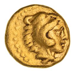 MACEDON, Kingdom of, Philip II - Alexander III, gold quarter stater, (2.12 g), 10mm, Pella Mint, (c.342-336/328 B.C.), obv. Head of Herakles to right, wearing lion skin headdress, dotted border, rev. kantharos above bow and club to left [**F]ILIPPOU* below, (S.6668, Le Rider 66 [D46/R34], SNG ANS 221-3, HGC 3.1, 851 var,SNG Cop 538 [same dies], SNG Lockett 1408 [same dies]. Struck slightly off centre on obverse, a few deposits, very fine and rare.