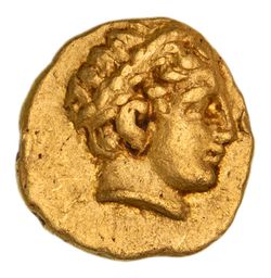 MACEDON, Kingdom of, Philip II - Alexander III, gold twelfth stater, (0.70 g), 8.5mm, Pella mint, struck 345/2-340/336 B.C.), obv. Head of Apollo to right, wearing laurel wreath, rev. thunderbolt above **FILIPPOU* below head of lion facing, (S.6676, Le Rider 27var (D?/R17), SNG ANS 205-215, HGC 3.1, 857). Very fine and rare.