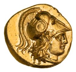 MACEDON, Kingdom of, Philip III Arrhidaios, (323-317 B.C.), gold stater, (8.57 g), Babylon Mint, issued 323-318/7 B.C. under Archon, Dokimos or Seleukos I, obv. head of Athena to right in crested Corinthian helmet, rev. Nike standing to left, holding wreath in outstretched hand, **LY* below left wing, M below right wing, **B ASILEWS* to left, to right **PHILIPPOU*, (cf.S.6702, Price P178). Mint bloom, extremely fine and rare.