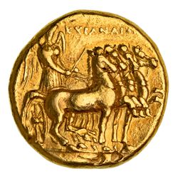 KYRENAICA, Kyrene, (322-308 B.C.), gold stater, (8.59 g), obv. slow quadriga driven by Nike, three ...