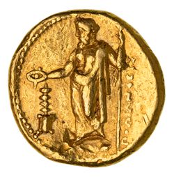 KYRENAICA, Kyrene, (322-308 B.C.), gold stater, (8.59 g), obv. slow quadriga driven by Nike, three quarter face to right, **KYPANAIO[N]* above, rev. Zeus Ammon standing facing head to left, sacrificing from phiale over thymiaterion and holding lotus-headed sceptre, on right, **POLIANQEUS*, (S.6301, BMC 120 (p.30), Fr.553, SNG Cop.1210 [Pl.XXIX). Knock in field on reverse, very fine and very rare.