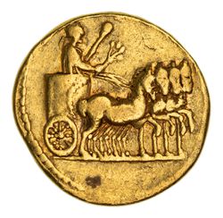VESPASIAN, (A.D. 69-79), gold aureus, Rome Mint, issued A.D. 7, (6.87 g), obv. laureate head right, around IMP CAES VESP AVG PM COS IIII, rev.Vespasian in triumphal quadriga right, (S.2257, RIC 364, BMC 79, C 642). Very fine / good very fine and scarce.