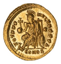 THEODOSIUS II, (408-450 AD), gold solidus, (4.44 g), Constantinople Mint, obv. pearl diademed, helmeted, and cuirassed bust facing, holding spear and shield, rev. Constantinopolis seated left, holding globus cruciger and sceptre, prow at foot, shield to right resting on throne (S.21158, RIC 257). Extremely fine.