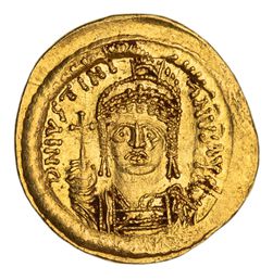 JUSTIN II, (565-578 A.D.), gold solidus, (4.44 g), Constantinople Mint, obv. helmeted and cuirassed bust ...
