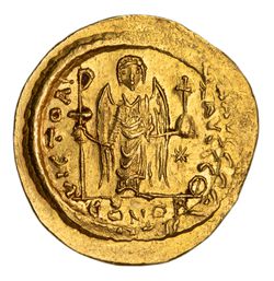 JUSTINIAN I, (A.D.527-565), gold solidus, Constantinople Mint, (4.48 g), 9th officina, issued 542-552, obv. bust of Justinian I facing, with plume and diadem, two pearls at each side, wearing cuirass, d N IVSTINI ANVS PP AVC around, rev. Angel facing in tunic and cloak, in right hand long cross composed of dots, globe in left hand cross above, star below, around VICTORI A AVGGG**Q*, CONOB in exergue, (S.139, DOC 9a, SB 140). Hoard patination attached to reverse, broad flan, otherwise very fine.