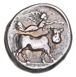 ITALY, Campania, Neapolis (Naples), (c.340-240 B.C.), silver stater or didrachm, (7.44 g), obv. head of nymph to right, astragalus behind, below **CARILE*, rev. man-headed bull walking to right, crowned by Nike flying right above, below K, below exergue of [**NEO]POLI[TWN*], (cf.S.307, Sambon 469b, SNG ANS 359 [same dies]). Toned, very fine and a scarce symbol.