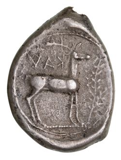 ITALY, Bruttium, Kaulonia, silver stater, 460-450 B.C. (Kraay chronology), (7.02 g), obv. Apollo naked walking to right, before him a small stag standing to right, looking back, KAV**L* behind downwards reversed, rev. stag standing to right, before, a sapling, KAV retrograde above, (S.462, SNG ANS 181 [same dies], Naville Sale V [British Museum duplicates, sold June 1923 (lot 656 same dies], Noe 96 [same dies]). Odd shape, very fine and rare.