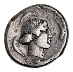 SICILY, Syracuse, (c.450-440 B.C.), silver tetradrachm, (17.12 g), obv. slow quadriga driven to right by male charioteer holding kentron in right hand and reins in both hands, Nike flying right crowning horses, ketos to right in exergue, rev. **SU*R**AKOSI ON* around to right, head of Artemis-Arethusa to right, hair rolled and tucked under diadem, wearing necklace, four dolphins clockwise around, (cf.S.914, Boehringer 532 [obverse 273/reverse 373 these dies], Pozzi [lot 577 same dies]). Attractive, very fine and very rare.