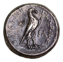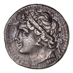 SICILY, Syracuse, silver four litrai, issued by Gelon II, son of Hieron II, (c. 218/7-216 B.C.), (3.34 g), obv. diademed head of Gelon to left, rev. **SURAKOSIOI GELWMOS*, eagle with closed wings standing to right on a thunderbolt, A to left, BA to right, (s.987, cco 295 [These dies], BAR issue 67, SNG ANS -, SNG Munich 1362 [same dies]). Nearly extremely fine, toned and rare.
