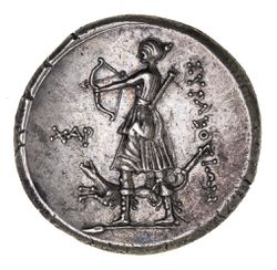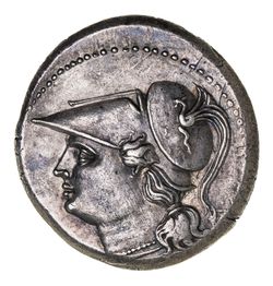 SICILY, Syracuse, The Syracusan Democracy, (214-212 B.C.), silver twelve litrai, (10.17 g), obv. head of Athena to left wearing crested Corinthian helmet, ornamented with griffin, rev. Artemis standing left in short chiton with quiver on shoulder and discharging an arrow from her bow, at her feet a hound running left, to right **SURAKOSIWN*, to left **CAR*, (cf.S.997, BMC 652, cf.SNG ANS 1218). Lightly toned, sharply struck, extremely fine with a powerful portrait, rare.