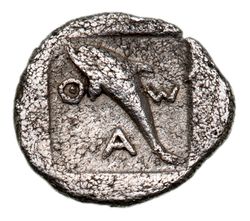 THRACE, Islands off Thrace, Thasos, (c.412-404 B.C.), silver hemiobol (0.23 g), obv. diademed head of nymph to left, rev. dolphin left within shallow incuse, around **QAS*, (cf.S.1757, Le Rider, Thasiennes 13, SNG Cop.1035, HGC 6, 341). Toned, some surface pitting, very fine or better and rare.