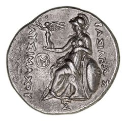THRACE, Kingdom of, Lysimachos, (305-281 B.C.), silver tetradrachm, (17.05 g), Magnesia ad Maeandrum Mint, issued 297/6-282/1 B.C., obv. head of Alexander to right, with diadem and horn of Ammon, within dotted circle, rev. Athena enthroned to left, supporting Nike, spear behind, monograms to inner left and exergue, to right **BASILEWS* downwards, to left **LUSIMAXOU* downwards, (cf.S.6814, unpublished in the standard references, but cf. Thompson 102 illustration for an tetradrachm struck from a die engraved by the same hand as that for the present piece. See also Thompson 96 for the same exergal monogram as here). Lightly toned, a few light scratches, very fine and very rare.