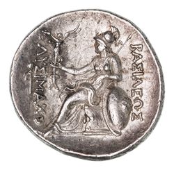 THRACE, Kingdom of, Lysimachos, (B.C. 323-218), silver tetradrachm, (16.96g), Parion mint, after 281 BC, obv. diademed head of Alexander to right, with horn of Ammon, rev. Athena enthroned to left, holding nike, spear behind and leaning on shield, **FL* monogram below Nike, thyrsos to left, **BASILEWS* **LUSIMAXOU* either side (Mueller 362, HGC 3). Nearly extremely fine.