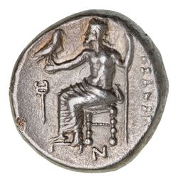 MACEDON, Kingdom of, Alexander III, (336-323 B.C.), silver drachm, (4.27 g), Lampsakos Mint, struck under Kalas or Demarchos, issued 328/5-323 B.C., obv. head of Herakles to right wearing lion skin, rev. Zeus Aetophoros seated on throne to left, eagle in outstretched hand, caduceus in left field, NA (or AN) monogram below throne, **[AL]EXANDRO[U]* to right, (cf.S.6730, Price 1343 corr (monogram not noted), ADM II 4 corr [same dies]). Good very fine - nearly extremely fine and extremely rare, only two known.