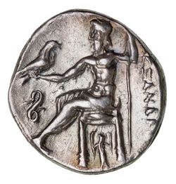 MACEDON, Kingdom of, Alexander III, (336-323 B.C.), silver drachm, (4.31 g), Lampsakos Mint, struck under Leonnatos, Arrhidaios, or Antigonos I Monophthalmos, obv. head of Herakles to right wearing lion skin, rev. Zeus Aetophoros^seated on throne to left, eagle in outstretched hand, buckle in left field, below throne, Artemis Phosphoros standing facing, **[AL]EXANDR[OU]* to right, (cf.S.6730, Price 1379 var (Artemis running left), ADM II Series IX, 267 = SNG von Post 12 [same dies]). Lightly toned, good very fine or better and a rare variety.