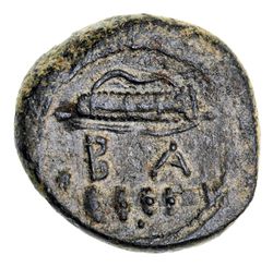 MACEDON, Kingdom of, Alexander III, (336-323 B.C.), AE 18, (5.96 g), Uncertain Macedonian mint (Amphipolis), issued c.325-310 B.C., obv. head of young Herakles to right wearing lion skin with dotted border, rev. above B A with star to left above a bow in case below a club to left, in exerque a pellet, (S.6742, Price 380 variety, cf.BMC 378a-c-, Alpha Bank -, no specimen in ANS). Delightful green earthen patina, extremely fine, very rare type.