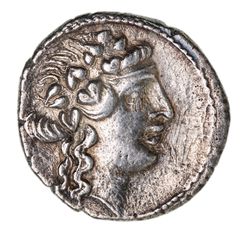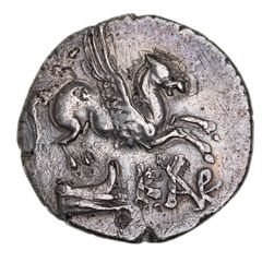 CORCYRA (KORKYRA), period of Roman protectorate, silver didrachm, after 229 - 48 B.C., (4.39 g), obv. head of young Dionysos, to right, wreathed with ivy, rev. Pegasos flying to right, beneath prow and three monograms PK, VA and KP, (cf.S.2027, BMC 355, cf.SNG Cop.200, SNG Evelpides 1931-2 65 [R1]). Toned, about extremely fine and very rare.