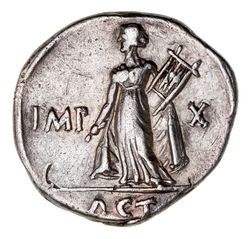 AUGUSTUS, (27 B.C. - A.D. 14), silver denarius, Lyons Mint, issued 15-13 B.C. (3.84 g), obv. bare head of Augustus to right, around AVGVSTVS DIVI F, rev. IMP to left X to right, in exergue ACT, Apollo Citharoedus in long drapery, standing to left, right hand holds plectrum and left hand a lyre, (S.1611, RIC 171a, RSC.144, BMC 461). Toned, good very fine/very fine and rare.