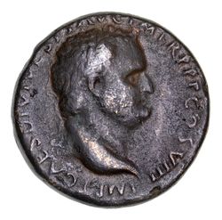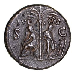 TITUS, (A.D. 79 - 81), AE sestertius, issued A.D. 80, Eastern mint (Thrace), (24.18 g), obv. laureate head of Titus to right, around IMP T CAES DIVI VESP AVG P M TR P P P COS VIII, rev. IVD CAP across field, S C across, Jewish woman seated under palm tree on left mourning, to right a Jew standing, (cf.S.2524, cf.H.1596, RIC 500, RPC 503 [very similar dies]). Fine/good fine and very rare, known by only a few examples.