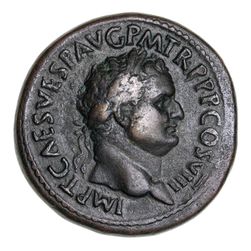 TITUS, (A.D. 79-81), AE sestertius, Rome Mint, issued A.D. 80-81, (27.74 g), obv. laureate head of Titus to right, around IMP T CAES VESP AVG P M TR P P P COS VIII, rev. Spes advancing to left holding flower and raising robe, S C across field, (S.2530, RIC 100, BMC 186, C.221). Attractive very fine and rare as such.