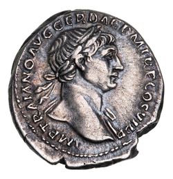 TRAJAN, (A.D. 98-117), silver denarius (3.22g), Rome mint, issued 100 AD, obv. laureate head of ...